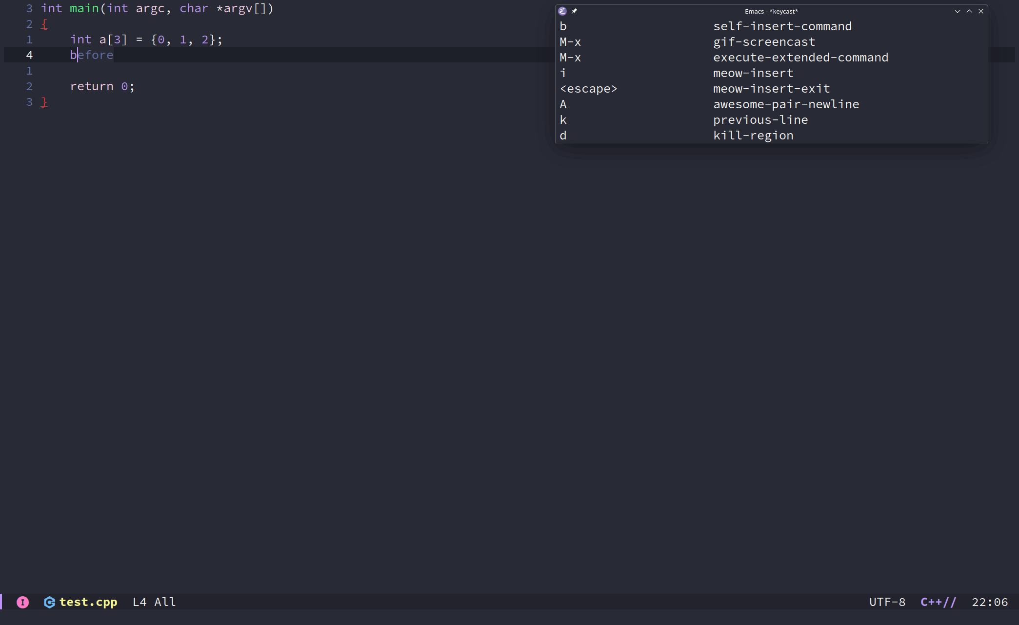 键盘宏,并且应用到选择的行上边,但最好使用 meow 进入 beacon-mode 后自动关闭括号自动配对功能,要不然括号自动配对会对宏编辑产生一些影响。